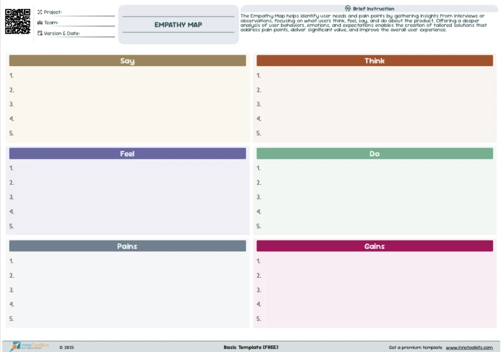 Empathy Mapping bridges the gap between user understanding and design decisions. GooValid enhances this tool with AI by helping you synthesize what users say, think, feel, and do—based on AI feedback from Exploratory Interviews and Observations. It doesn’t just ask you to look at filled boxes; it guides you with AI-generated prompts and sentiment analysis.