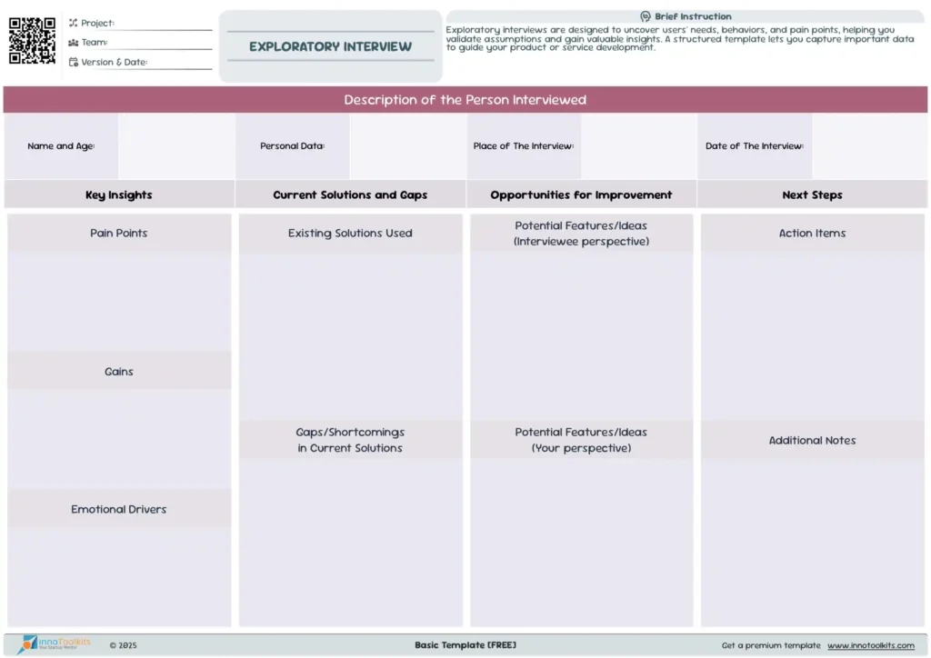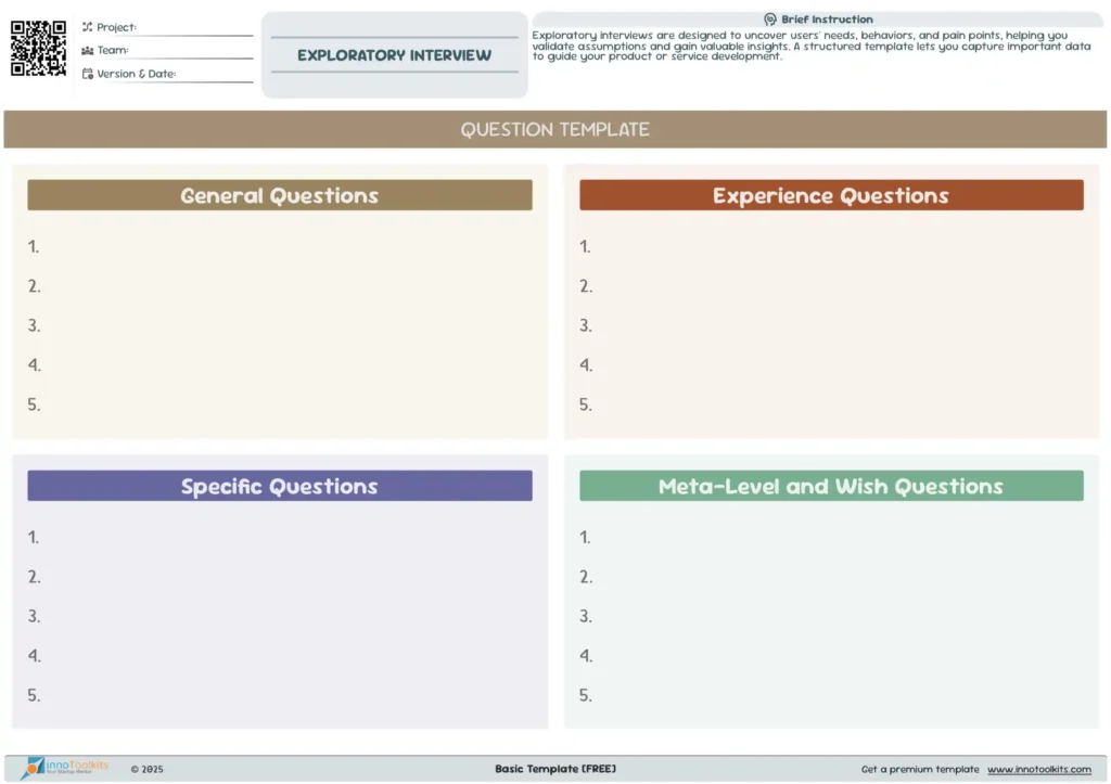 Exploratory Interviews are essential for empathizing with users and uncovering their unmet needs. GooValid streamlines the entire process—from crafting interview questions to extracting meaningful insights. It helps entrepreneurs prepare structured interviews based on industry-specific pain points and customer profiles.