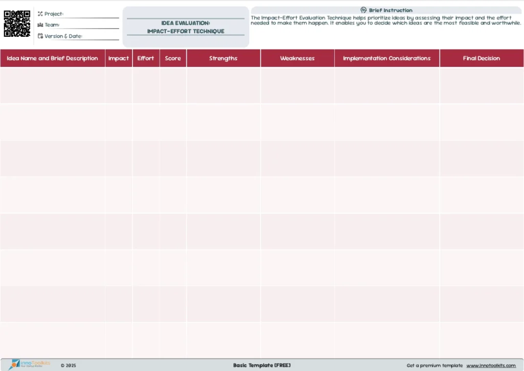 In the innovation journey, not all ideas are equal. The Impact–Effort Matrix helps you evaluate which solutions deserve your limited time and resources—balancing ambition with feasibility. At GooValid, this toolkit doesn’t stand alone; it integrates input from earlier creative techniques like SCAMPER and Six Thinking Hats, ensuring only the most promising ideas are prioritized for execution. By plotting ideas on a 2×2 matrix of high/low impact and high/low effort, innovators gain clarity on what to pursue now, later, or never.