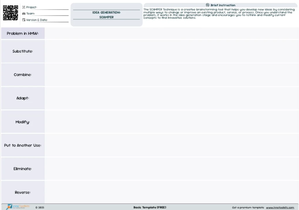 The SCAMPER Toolkit in GooValid provides a structured, creativity-boosting method to generate innovative solutions through seven techniques: Substitute, Combine, Adapt, Modify, Put to another use, Eliminate, and Reverse. Whether refining an existing idea or developing a novel one, this tool encourages lateral thinking and opens up creative opportunities for startups and corporate teams alike.