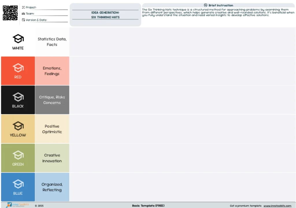 Facilitate balanced ideation guided by structured perspectives—data-driven facts, emotional insight, creative alternatives, risk spotting, and process control—all with AI-generated prompts.