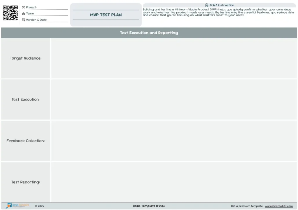 The MVP Test Plan toolkit is where assumptions meet reality and where core products or features go to market for product-market fit tests. GooValid helps startups and intrapreneurs design a Minimum Viable Product (MVP) test that captures the core value of the solution and evaluates it under real-world conditions. Our structured framework guides you in defining test objectives, key hypotheses, metrics, and success criteria—ensuring every test serves a clear learning purpose.
