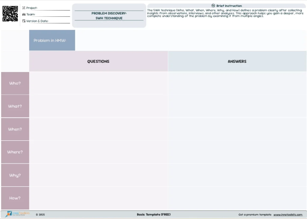 GooValid’s 5WH Toolkit (Who, What, Where, When, Why, and How) helps you dive deeper into the root causes of a problem by structuring the right questions. It bridges the gap between surface-level issues and the underlying factors that shape user behavior, market challenges, or operational friction. Powered by AI, the tool suggests context-aware, customized question prompts based on previous inputs from your Observation, Exploratory Interview, Empathy Map, and Persona Analysis—ensuring you explore every angle with purpose.